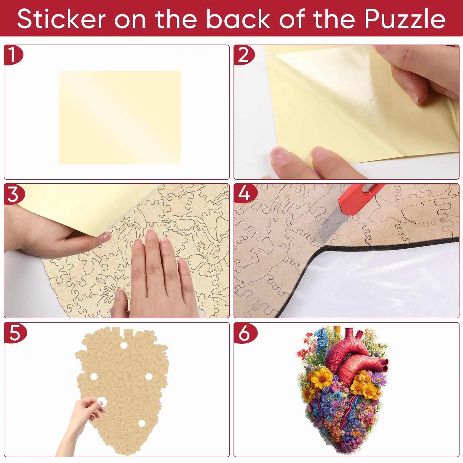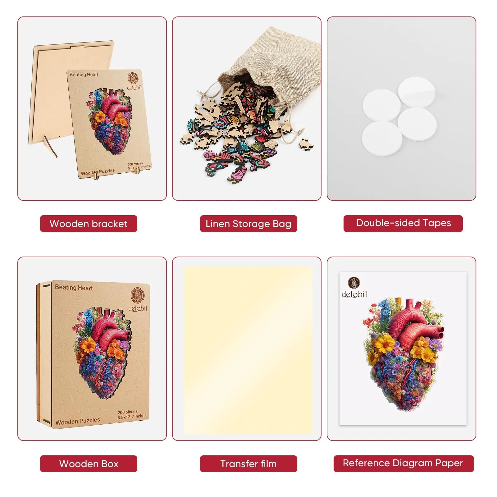 1 x unique shape wooden jigsaw puzzles, 1 x Reference picture, 1 x Puzzle Saver sticker, 4 x Double-sided Tapes, 1 x Storage bag & Wooden Box.