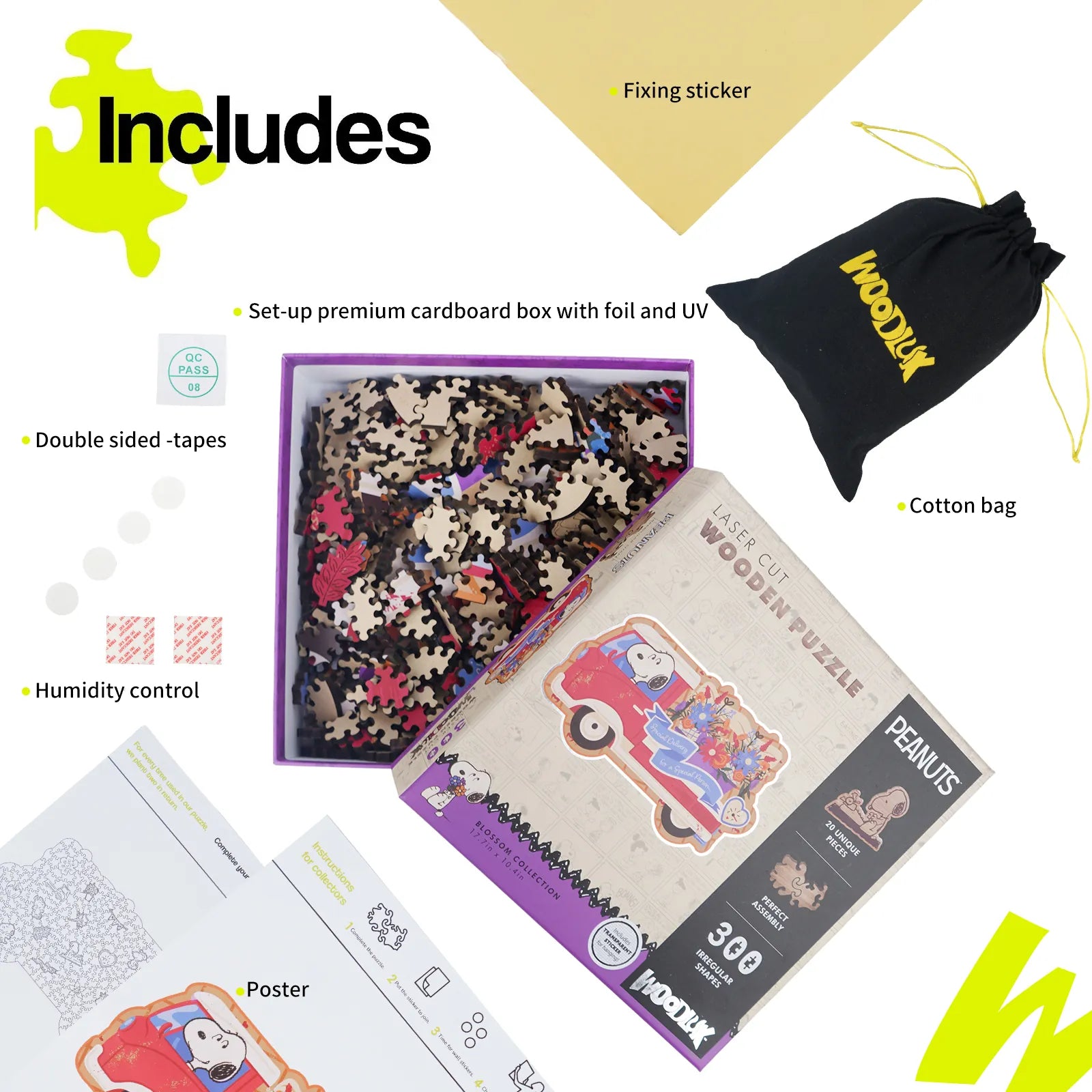 A wooden puzzle licensed from Peanuts. It features 300 irregular-shaped pieces cut with precision using laser, with a thickness of 5 mm for durability and a premium feel. The puzzle showcases a Snoopy special scene and includes 20 unique surprise shapes that add discovery and challenge. Sold as a gift suitable for families, Snoopy fans, or puzzle enthusiasts during holidays or birthdays, it emphasizes eco-friendly packaging and an accompanying cloth bag for storage and display. Overall, it highlights quality materials, intricate piece design, and collectible value.