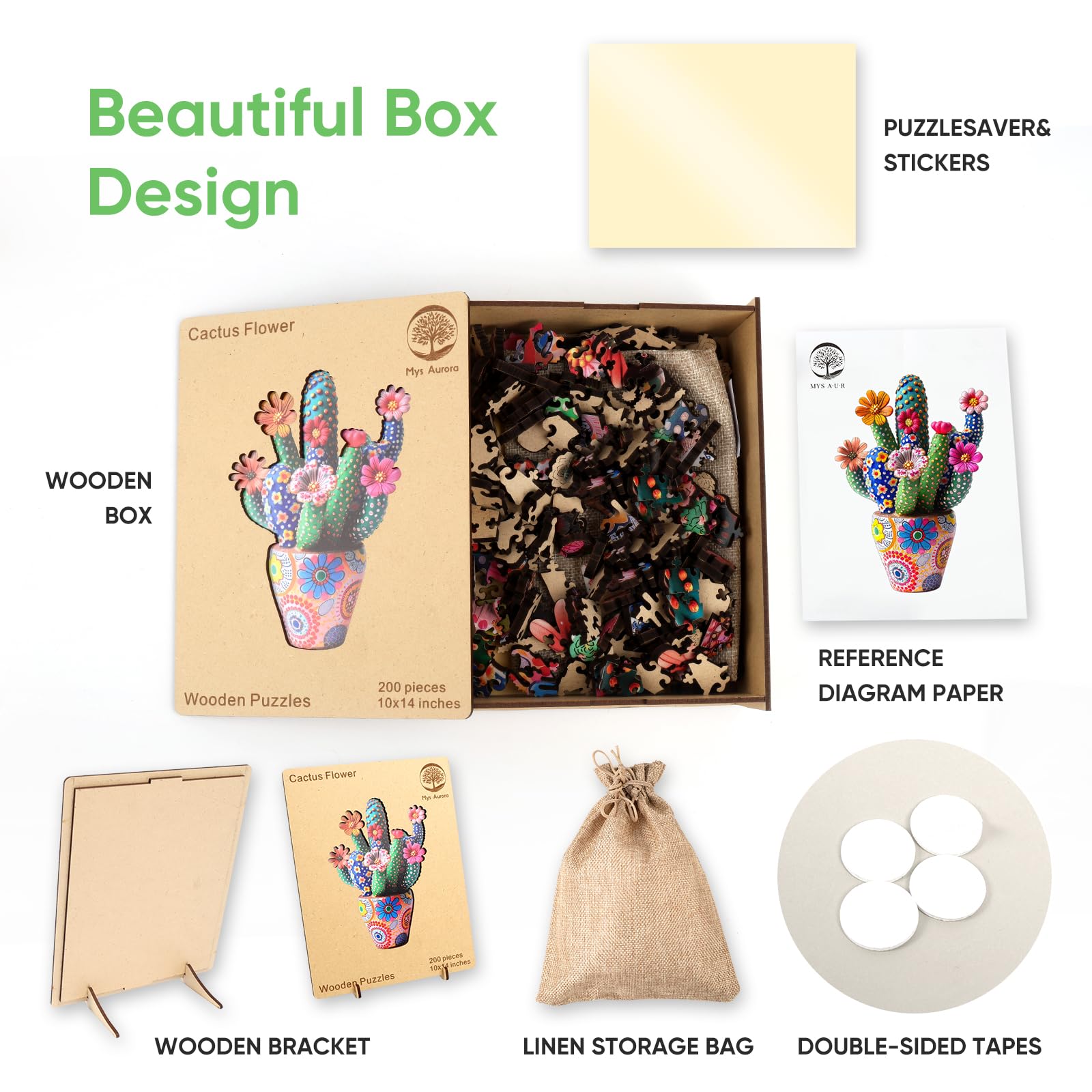 1 x unique shape wooden jigsaw puzzles, 1 x Reference picture, 1 x Puzzle Saver sticker, 4 x Double-sided Tapes, 1 x Storage bag & Wooden Box.