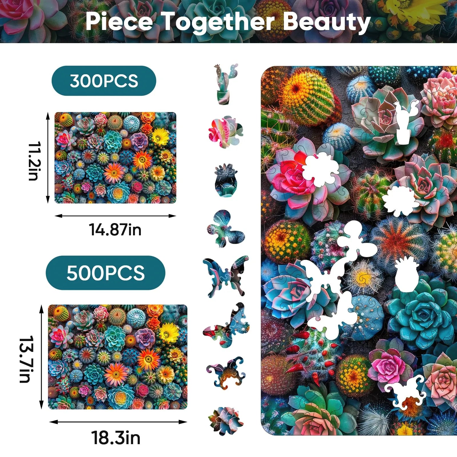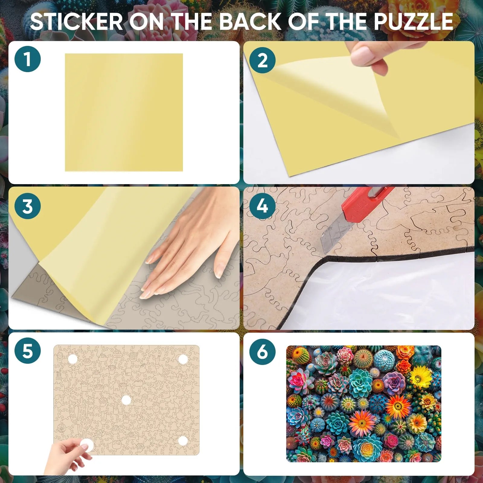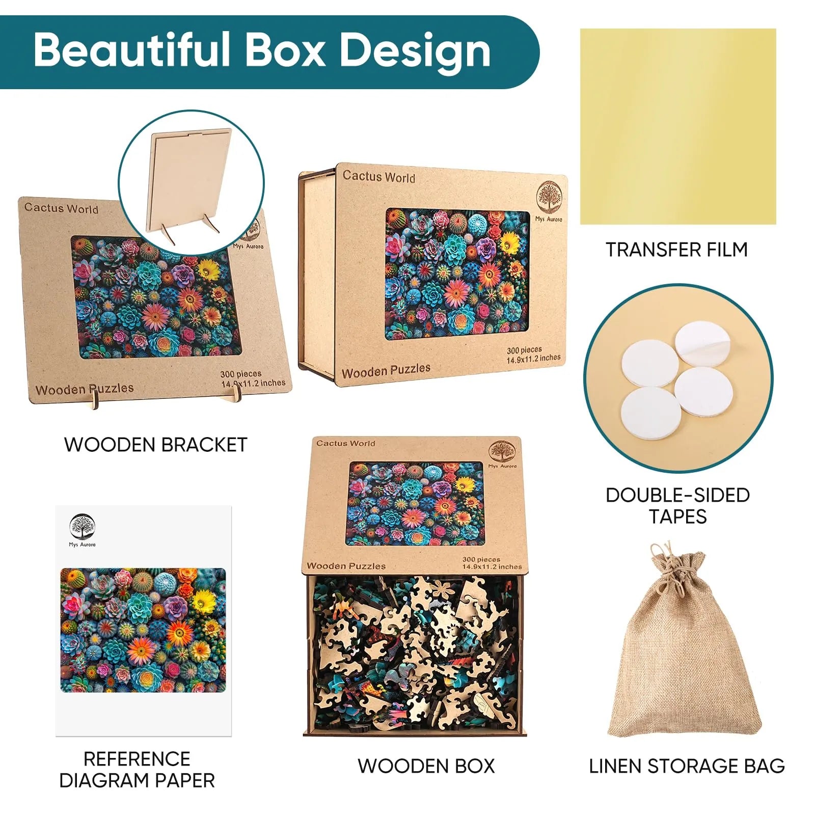 1 x unique shape wooden jigsaw puzzles, 1 x Reference picture, 1 x Puzzle Saver sticker, 4 x Double-sided Tapes, 1 x Storage bag & Wooden Box.