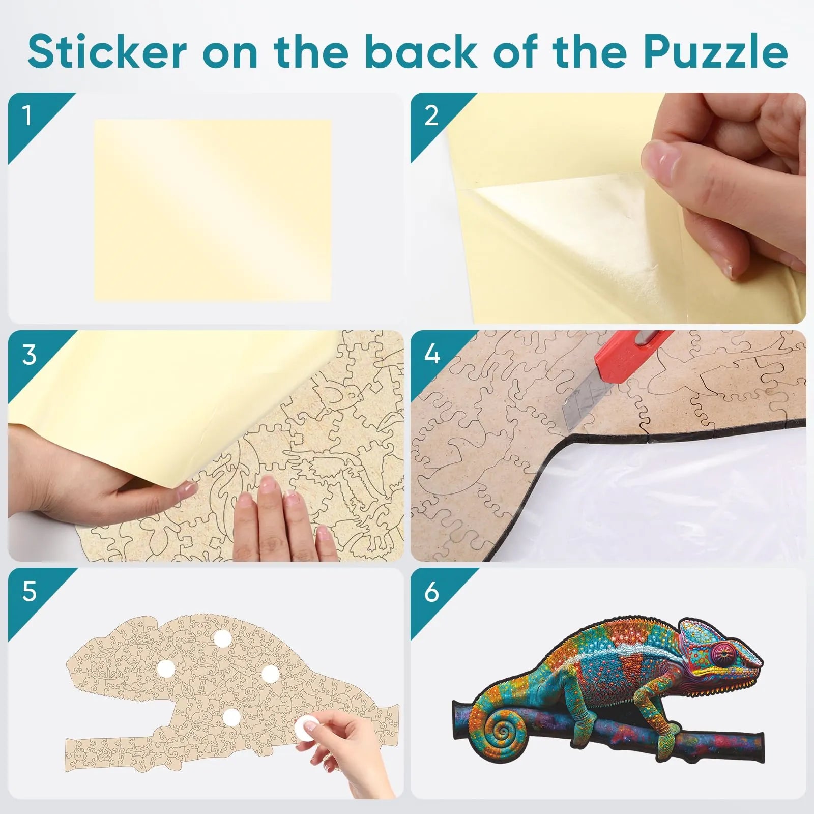 1 x unique shape wooden jigsaw puzzles, 1 x Reference picture, 1 x Puzzle Saver sticker, 4 x Double-sided Tapes, 1 x Storage bag & Wooden Box.