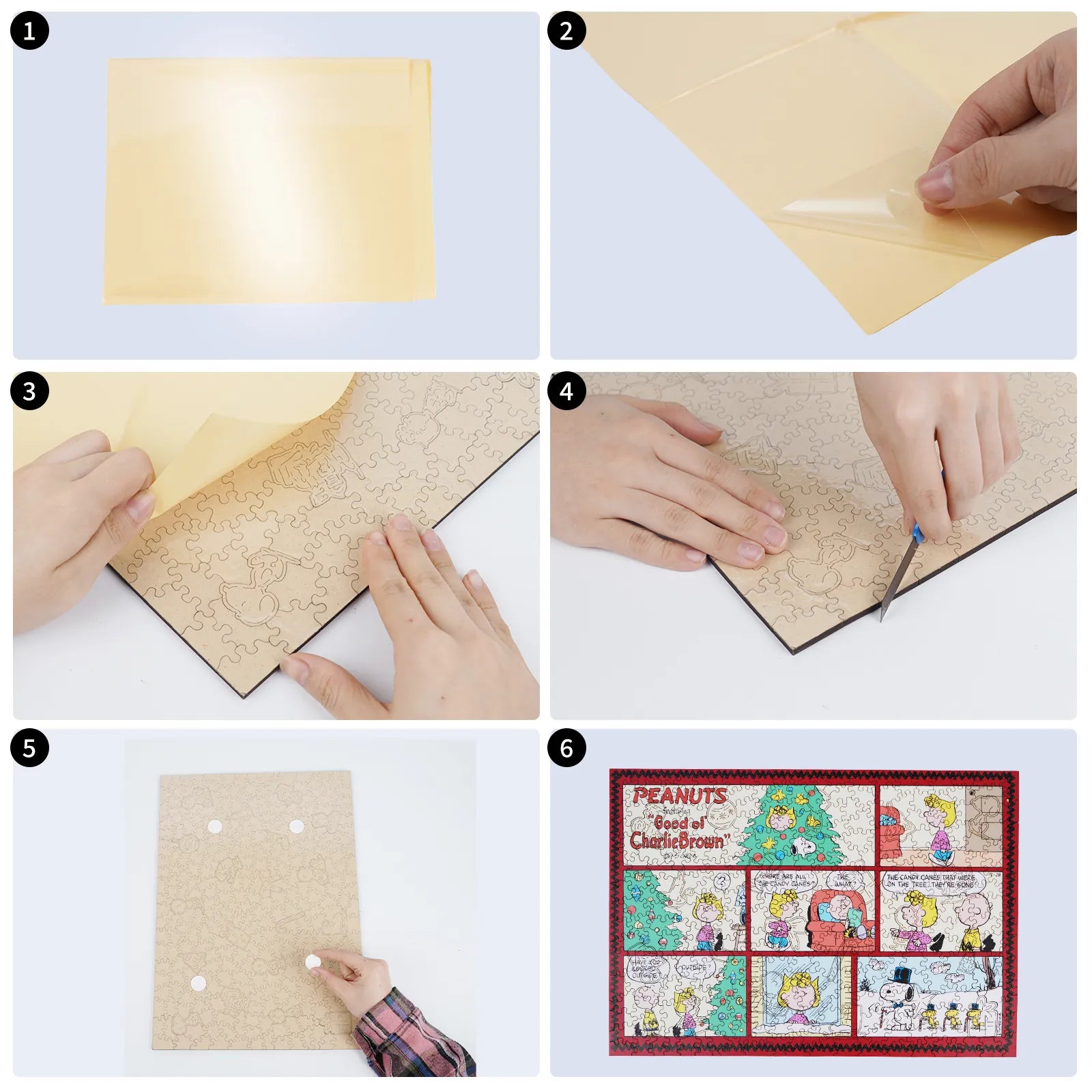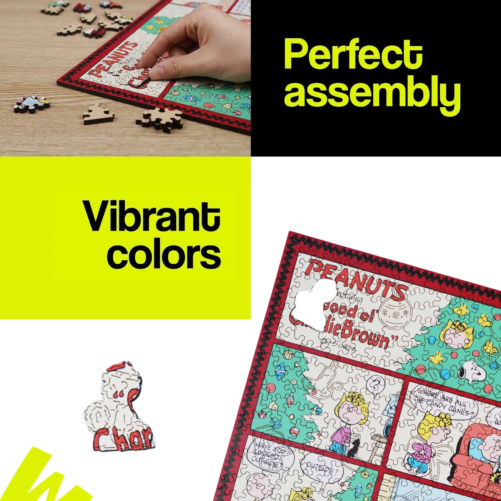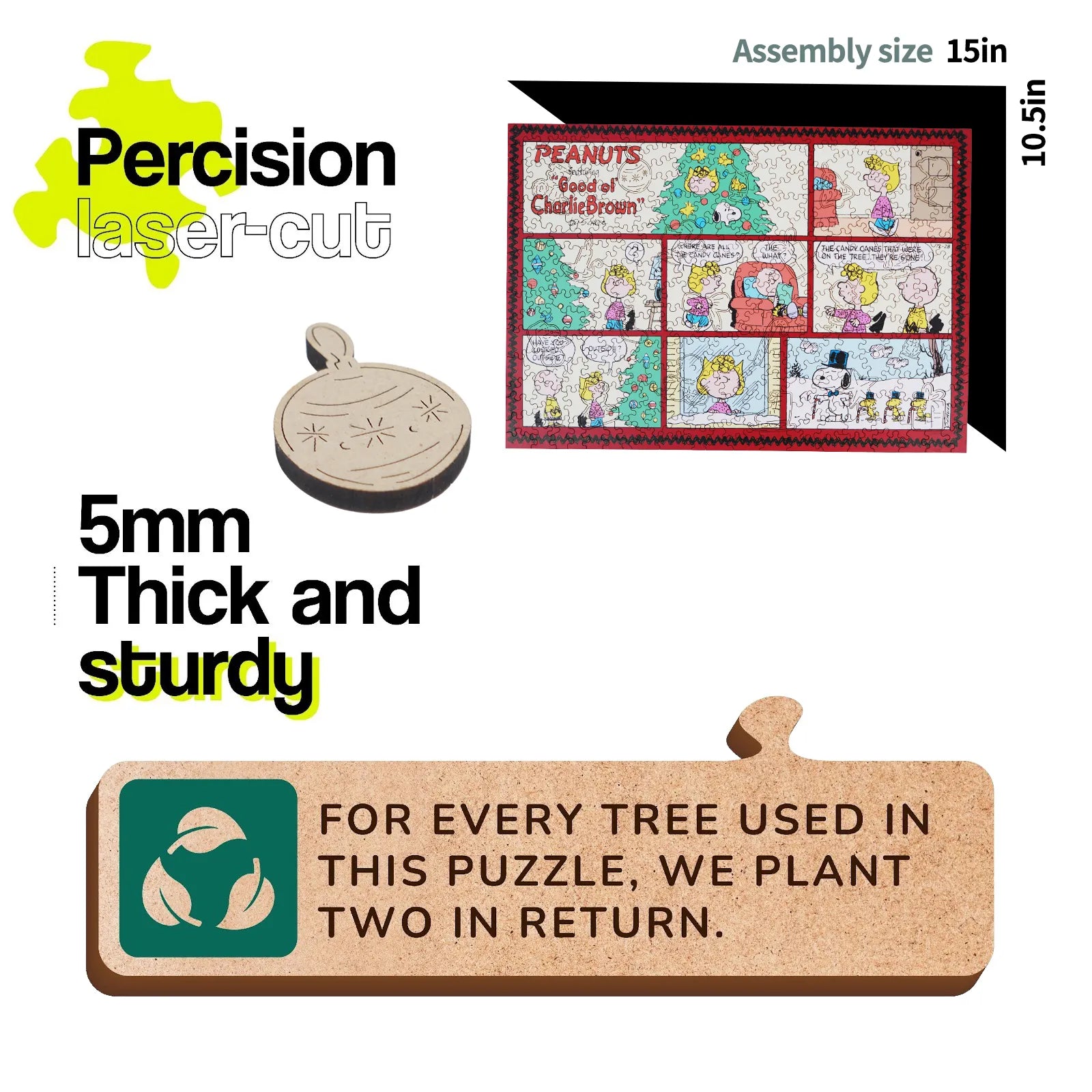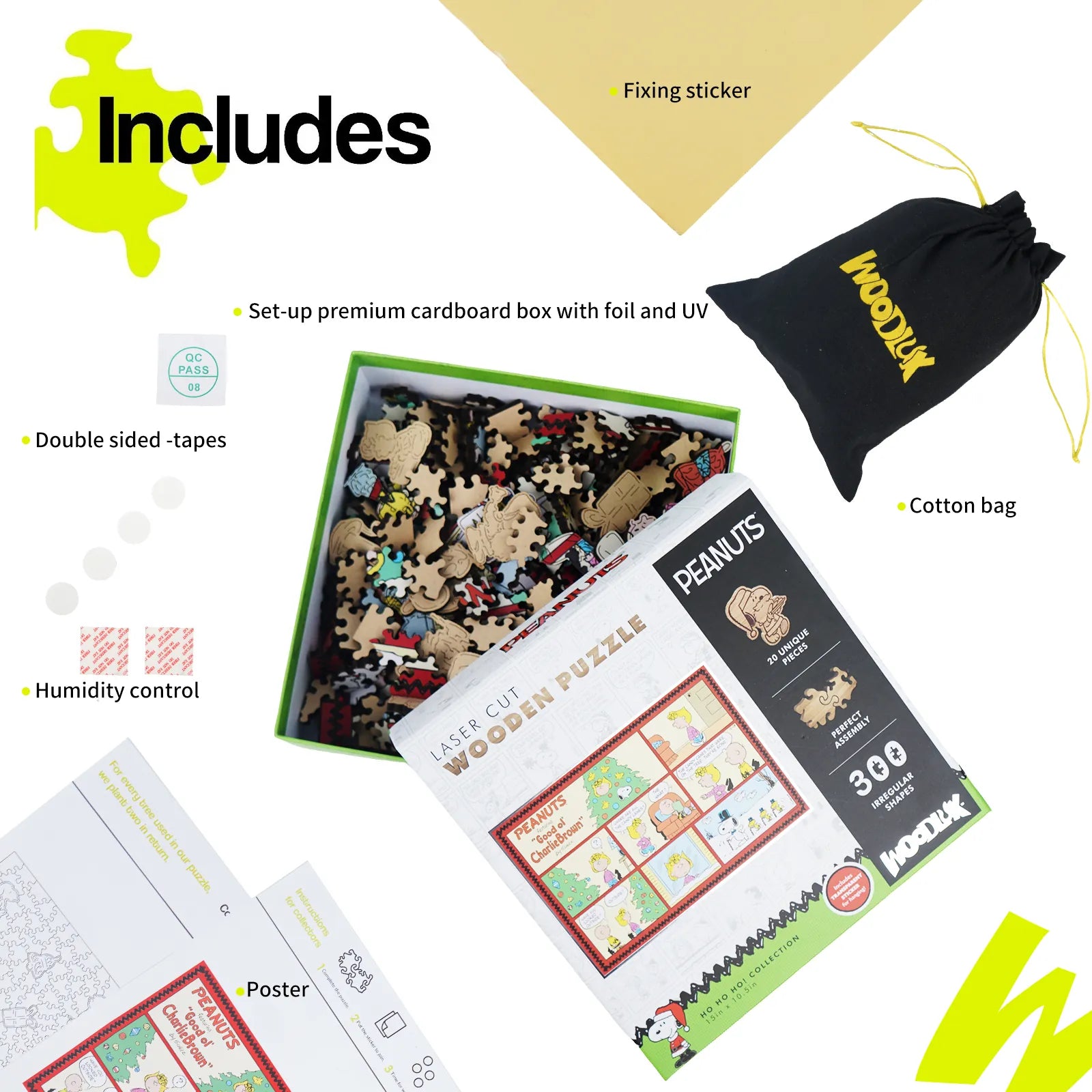 A wooden puzzle licensed from Peanuts. It features 300 irregular-shaped pieces cut with precision using laser, with a thickness of 5 mm for durability and a premium feel. The puzzle showcases a Snoopy special scene and includes 20 unique surprise shapes that add discovery and challenge. Sold as a gift suitable for families, Snoopy fans, or puzzle enthusiasts during holidays or birthdays, it emphasizes eco-friendly packaging and an accompanying cloth bag for storage and display. Overall, it highlights quality materials, intricate piece design, and collectible value.