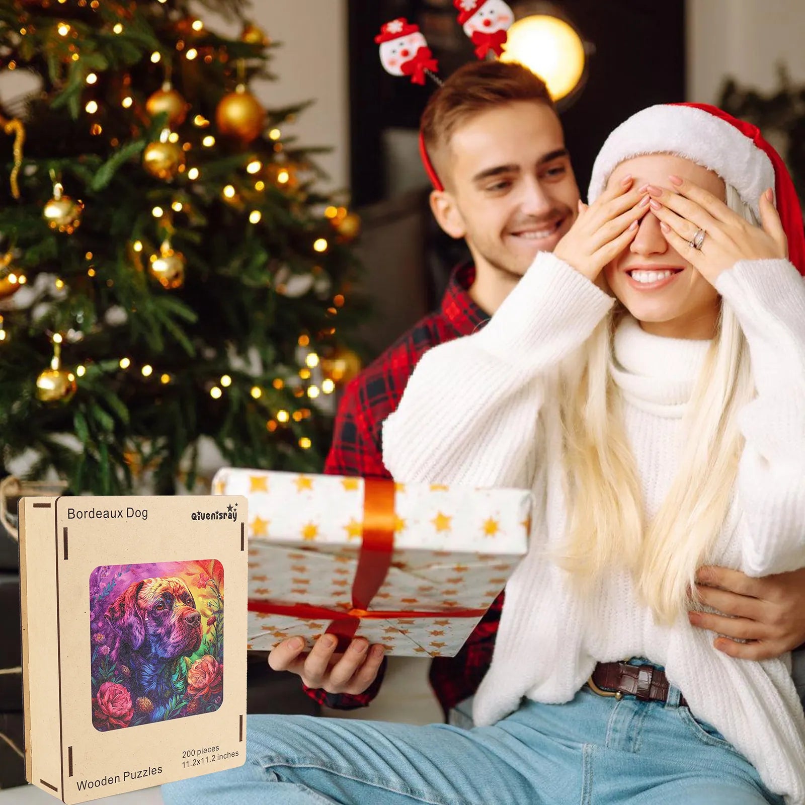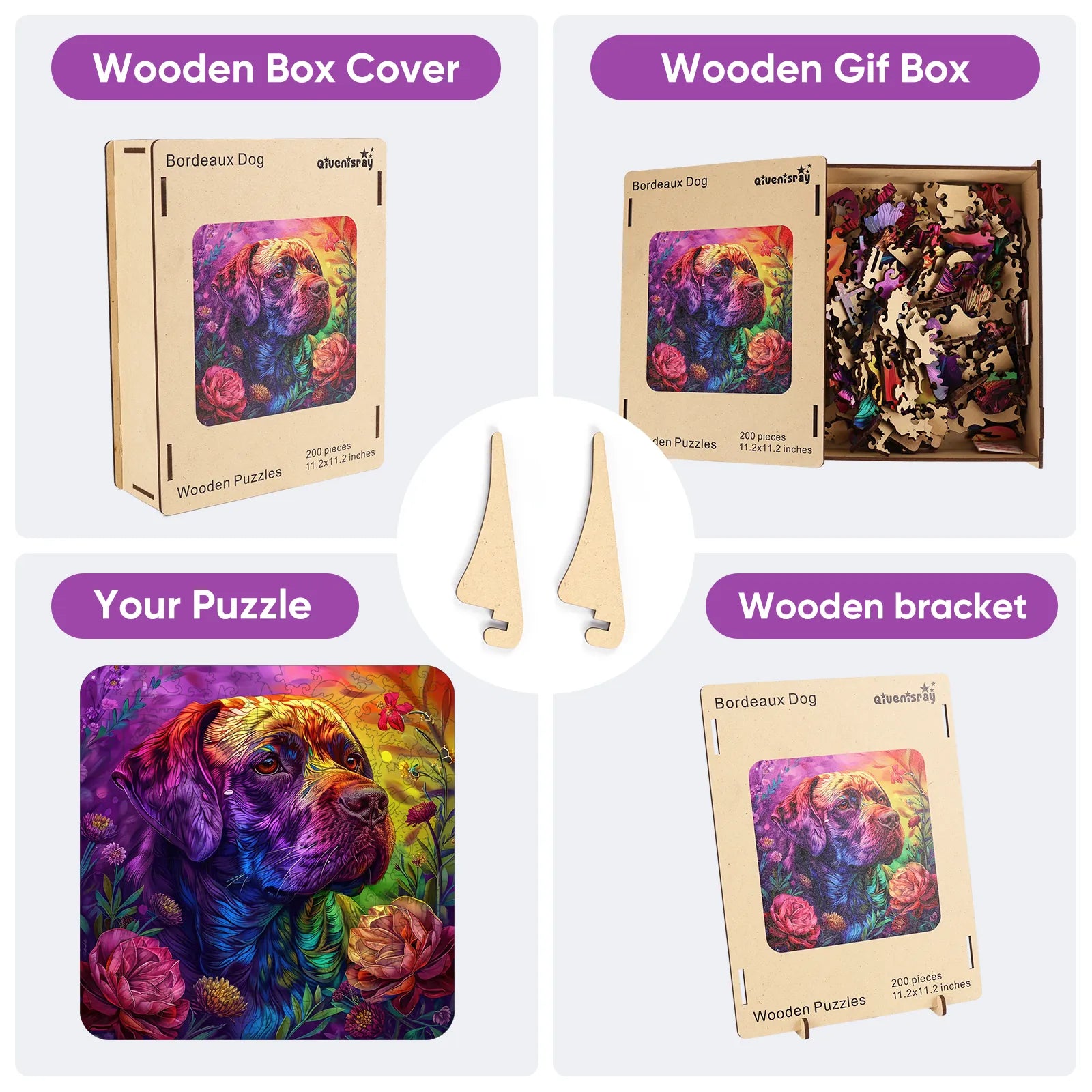 1 x unique shape wooden jigsaw puzzles, 1 x Reference picture, 1 x Puzzle Saver sticker, 4 x Double-sided Tapes, 1 x Storage bag & Wooden Box.