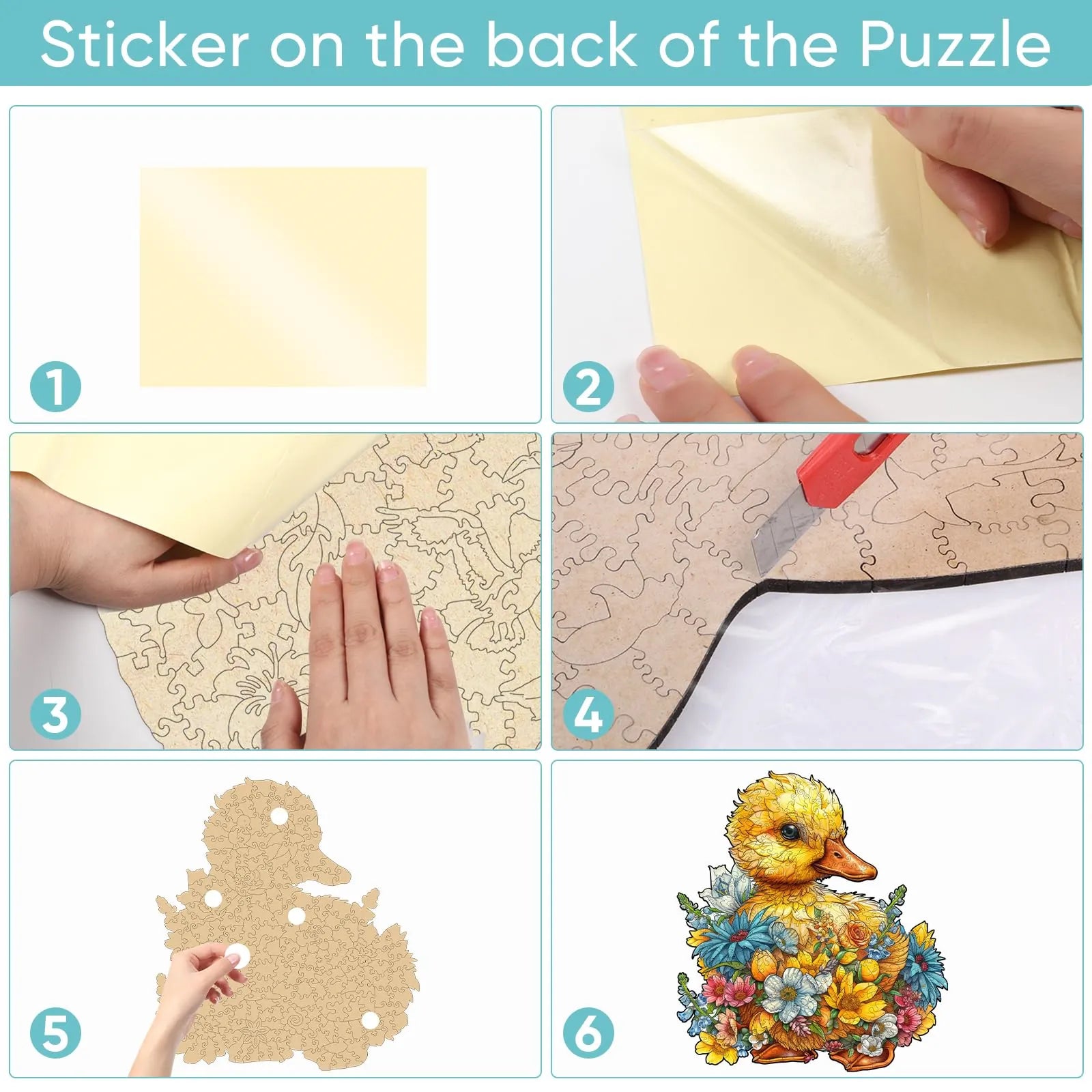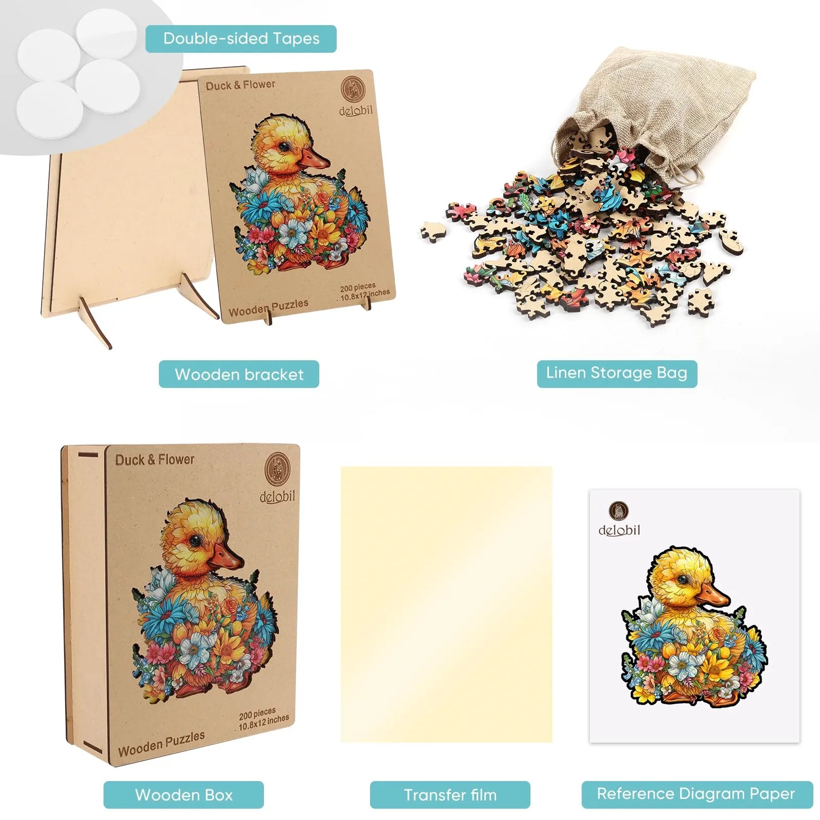 1 x unique shape wooden jigsaw puzzles, 1 x Reference picture, 1 x Puzzle Saver sticker, 4 x Double-sided Tapes, 1 x Storage bag & Wooden Box.