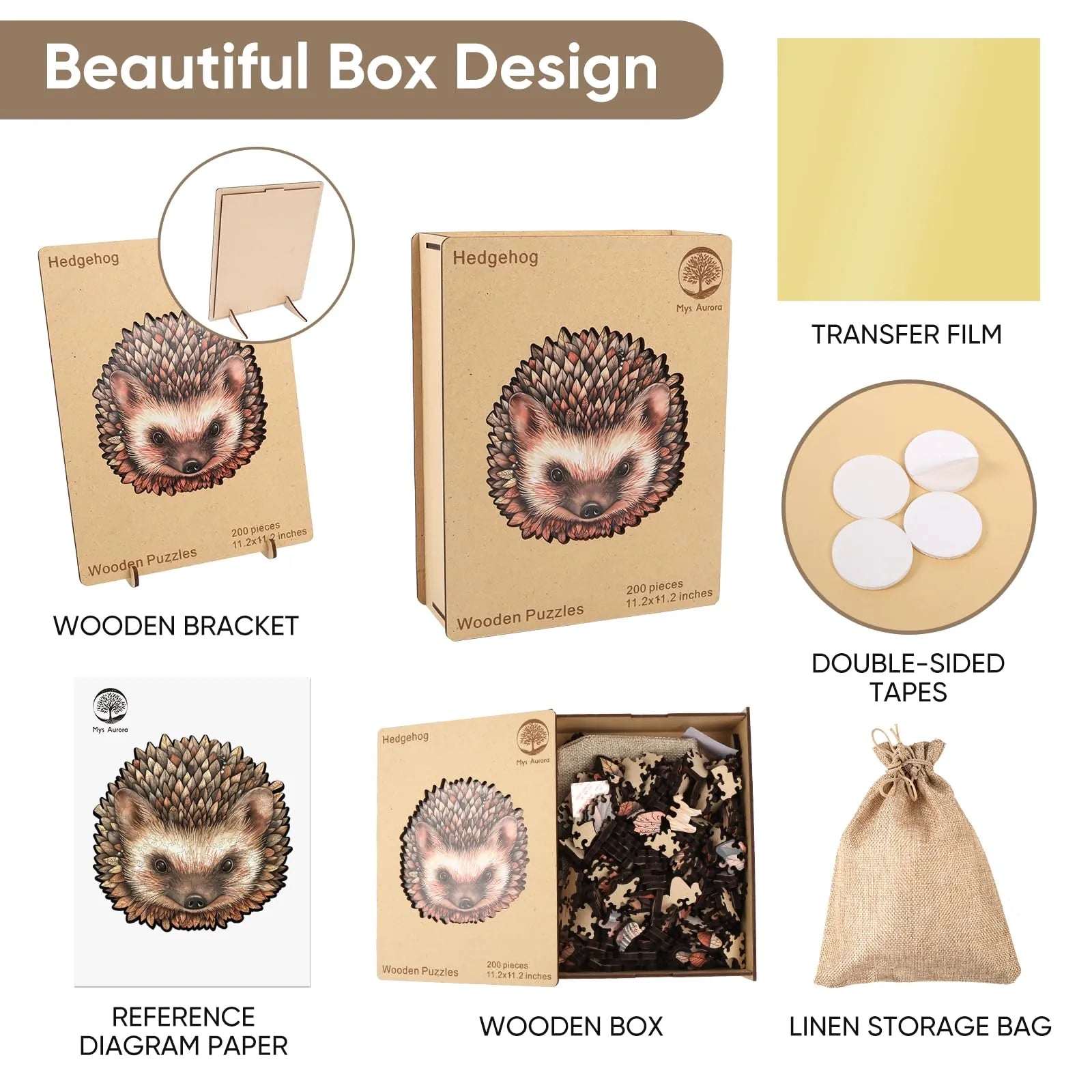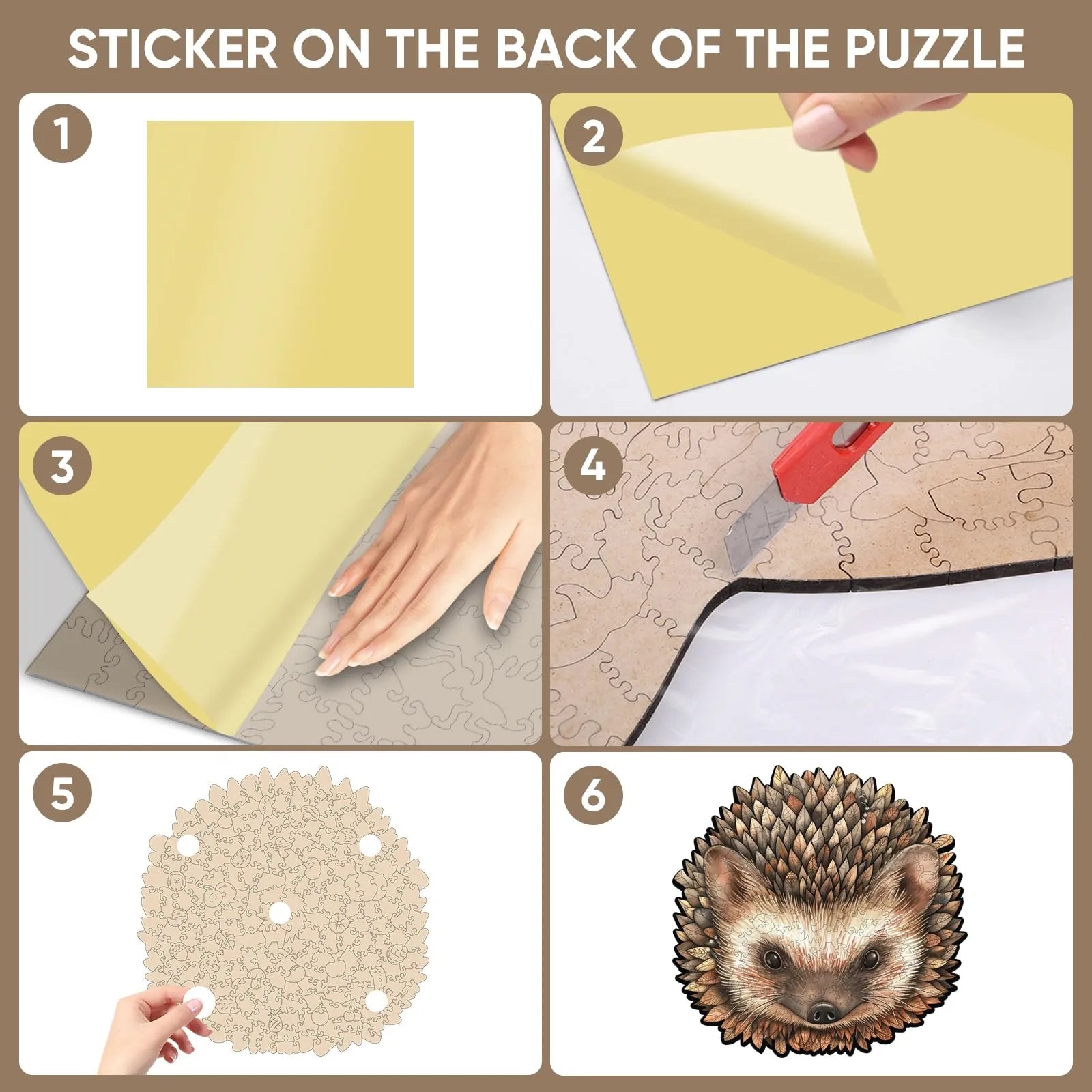 1 x unique shape wooden jigsaw puzzles, 1 x Reference picture, 1 x Puzzle Saver sticker, 4 x Double-sided Tapes, 1 x Storage bag & Wooden Box.
