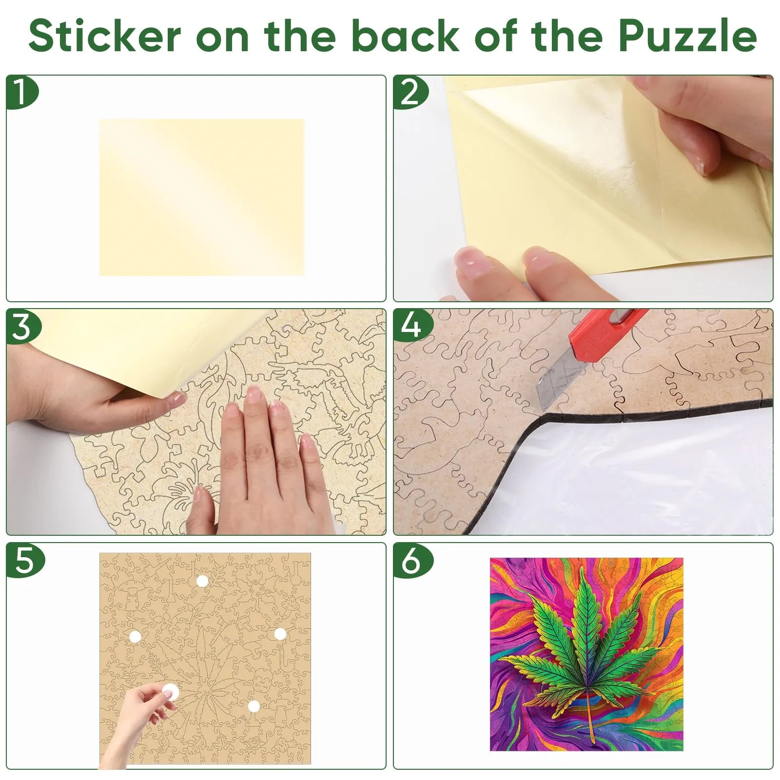 1 x unique shape wooden jigsaw puzzles, 1 x Reference picture, 1 x Puzzle Saver sticker, 4 x Double-sided Tapes, 1 x Storage bag & Wooden Box.