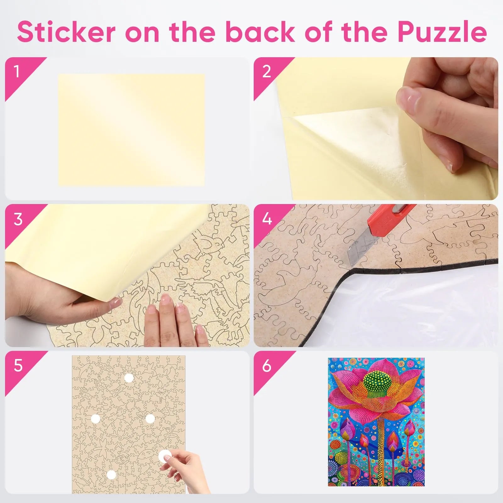 1 x unique shape wooden jigsaw puzzles, 1 x Reference picture, 1 x Puzzle Saver sticker, 4 x Double-sided Tapes, 1 x Storage bag & Wooden Box.