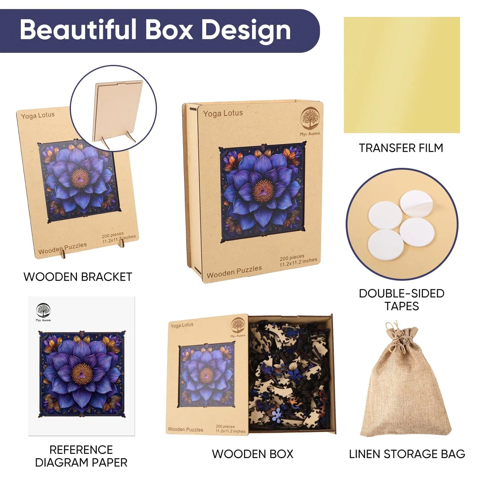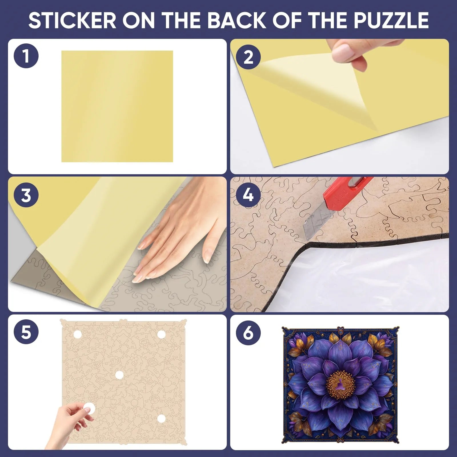 1 x unique shape wooden jigsaw puzzles, 1 x Reference picture, 1 x Puzzle Saver sticker, 4 x Double-sided Tapes, 1 x Storage bag & Wooden Box.