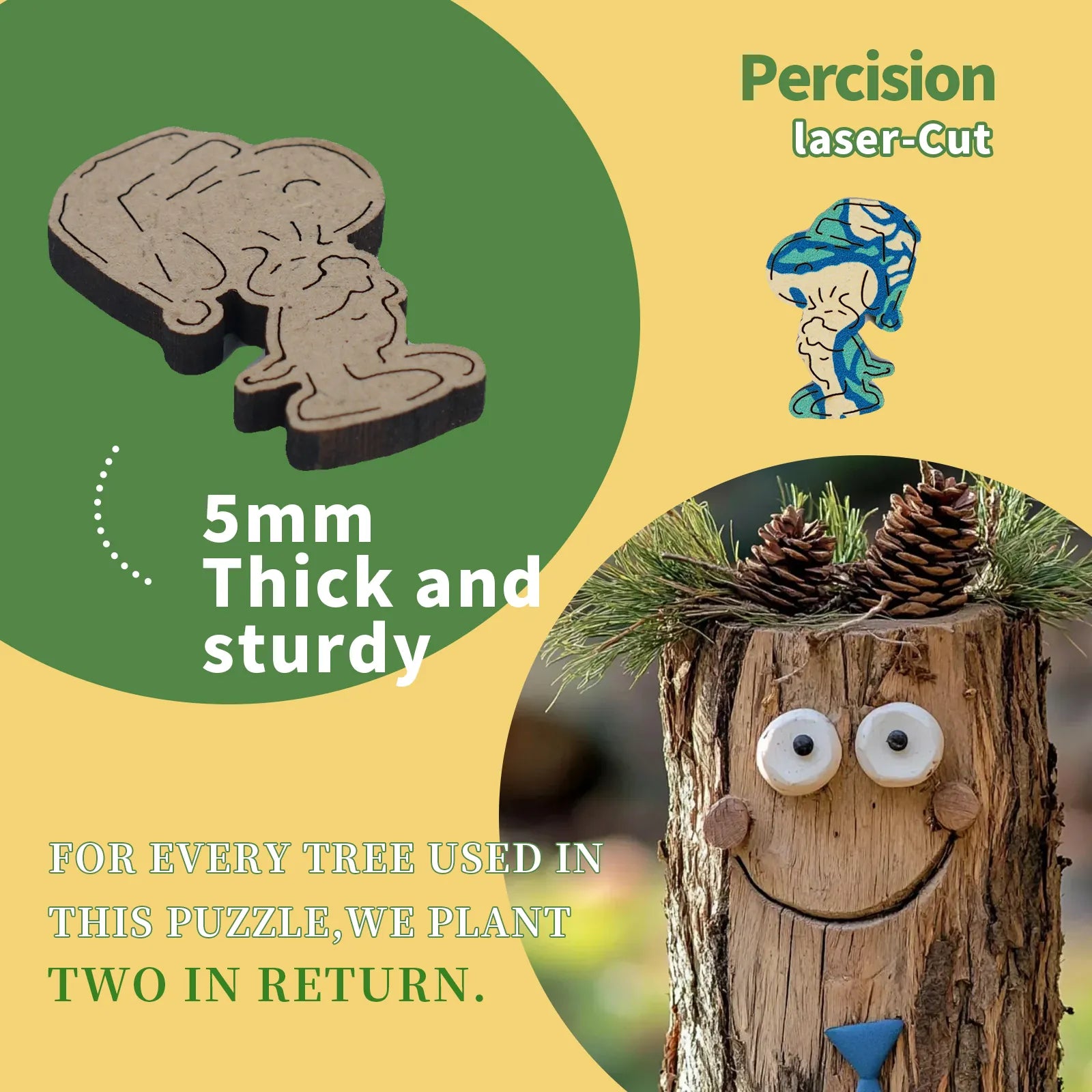 A wooden puzzle licensed from Peanuts. It features 200 irregular-shaped pieces cut with precision using laser, with a thickness of 5 mm for durability and a premium feel. The puzzle showcases a Snoopy special scene and includes 15 unique surprise shapes that add discovery and challenge. Sold as a gift suitable for families, Snoopy fans, or puzzle enthusiasts during holidays or birthdays, it emphasizes eco-friendly packaging and an accompanying cloth bag for storage and display. Overall, it highlights quality materials, intricate piece design, and collectible value.