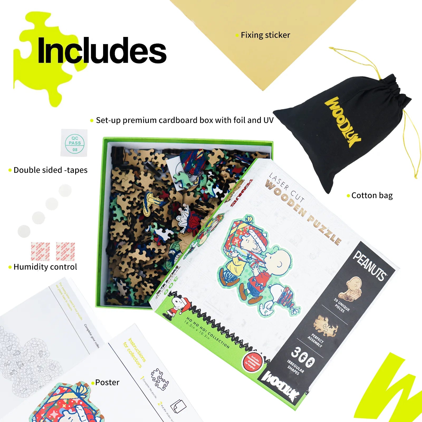 A wooden puzzle licensed from Peanuts. It features 300 irregular-shaped pieces cut with precision using laser, with a thickness of 5 mm for durability and a premium feel. The puzzle showcases a Snoopy special scene and includes 20 unique surprise shapes that add discovery and challenge. Sold as a gift suitable for families, Snoopy fans, or puzzle enthusiasts during holidays or birthdays, it emphasizes eco-friendly packaging and an accompanying cloth bag for storage and display. Overall, it highlights quality materials, intricate piece design, and collectible value.