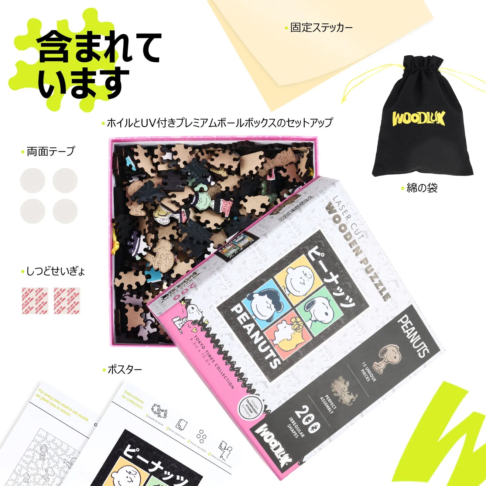 A wooden puzzle licensed from Peanuts. It features 200 irregular-shaped pieces cut with precision using laser, with a thickness of 5 mm for durability and a premium feel. The puzzle showcases a Snoopy special scene and includes 15 unique surprise shapes that add discovery and challenge. Sold as a gift suitable for families, Snoopy fans, or puzzle enthusiasts during holidays or birthdays, it emphasizes eco-friendly packaging and an accompanying cloth bag for storage and display. Overall, it highlights quality materials, intricate piece design, and collectible value.