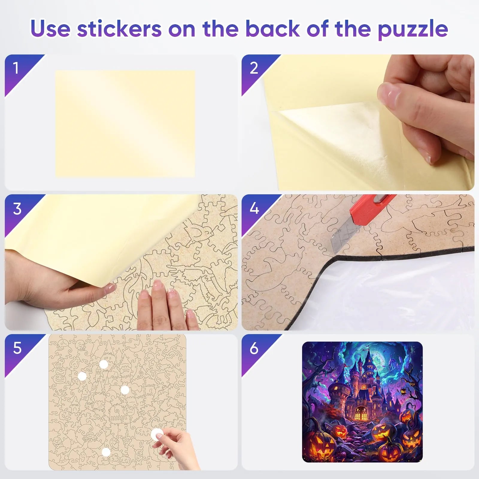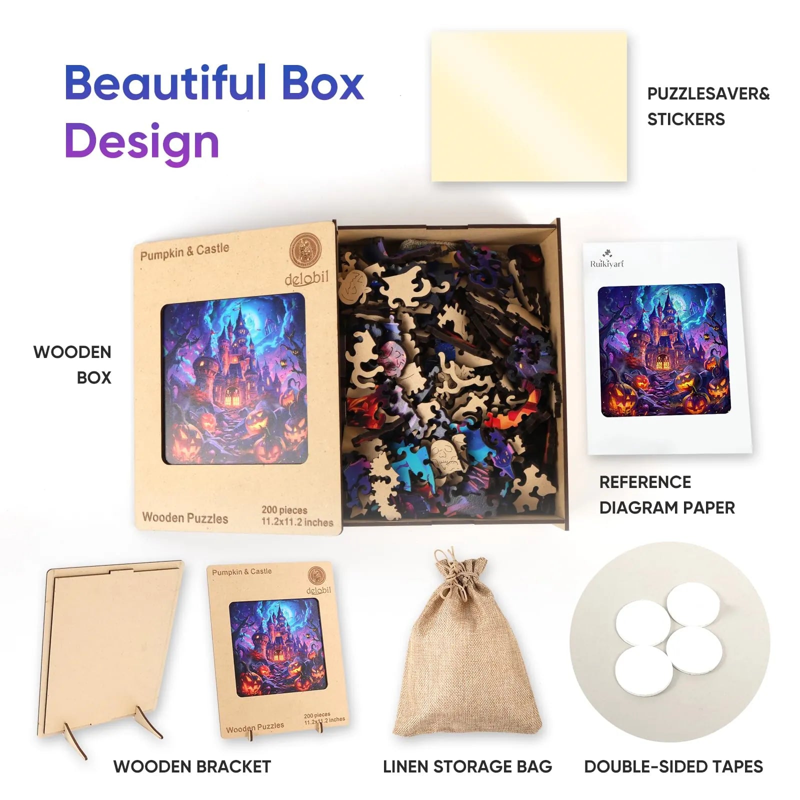 1 x unique shape wooden jigsaw puzzles, 1 x Reference picture, 1 x Puzzle Saver sticker, 4 x Double-sided Tapes, 1 x Storage bag & Wooden Box.