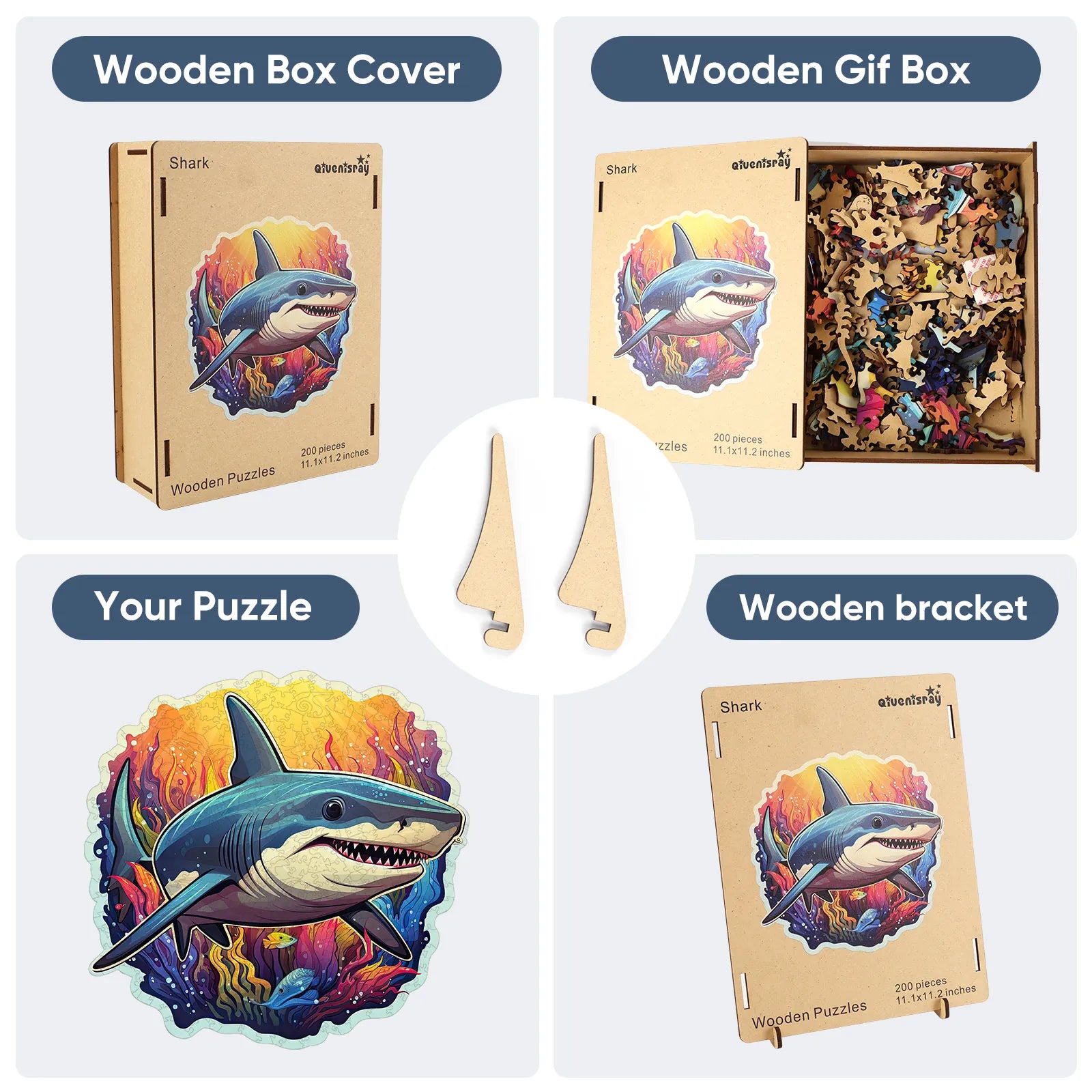 1 x unique shape wooden jigsaw puzzles, 1 x Reference picture, 1 x Puzzle Saver sticker, 4 x Double-sided Tapes, 1 x Storage bag & Wooden Box.