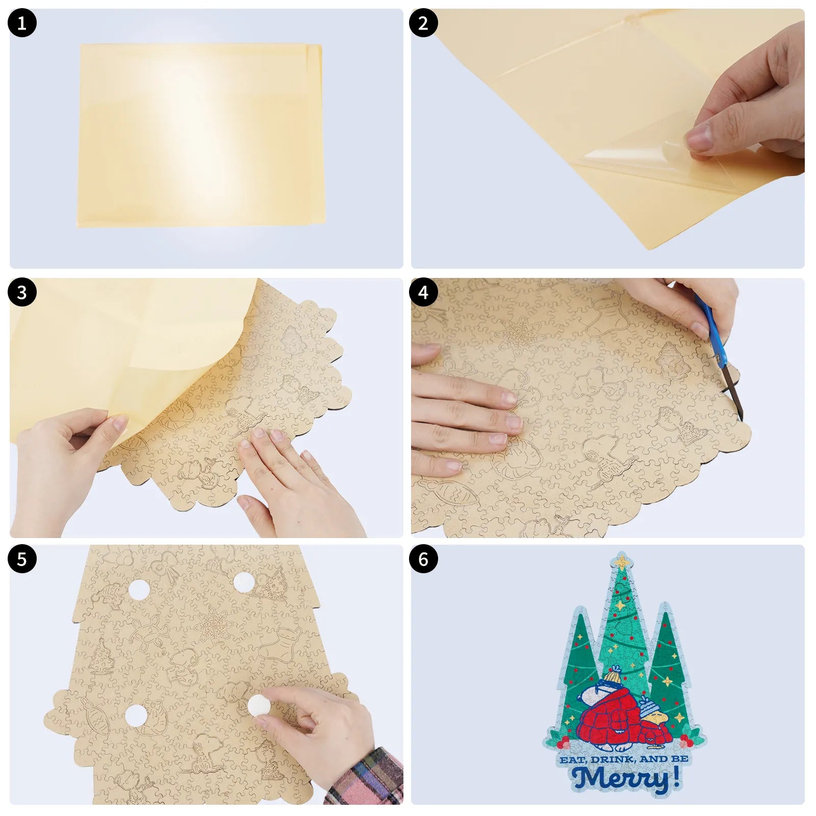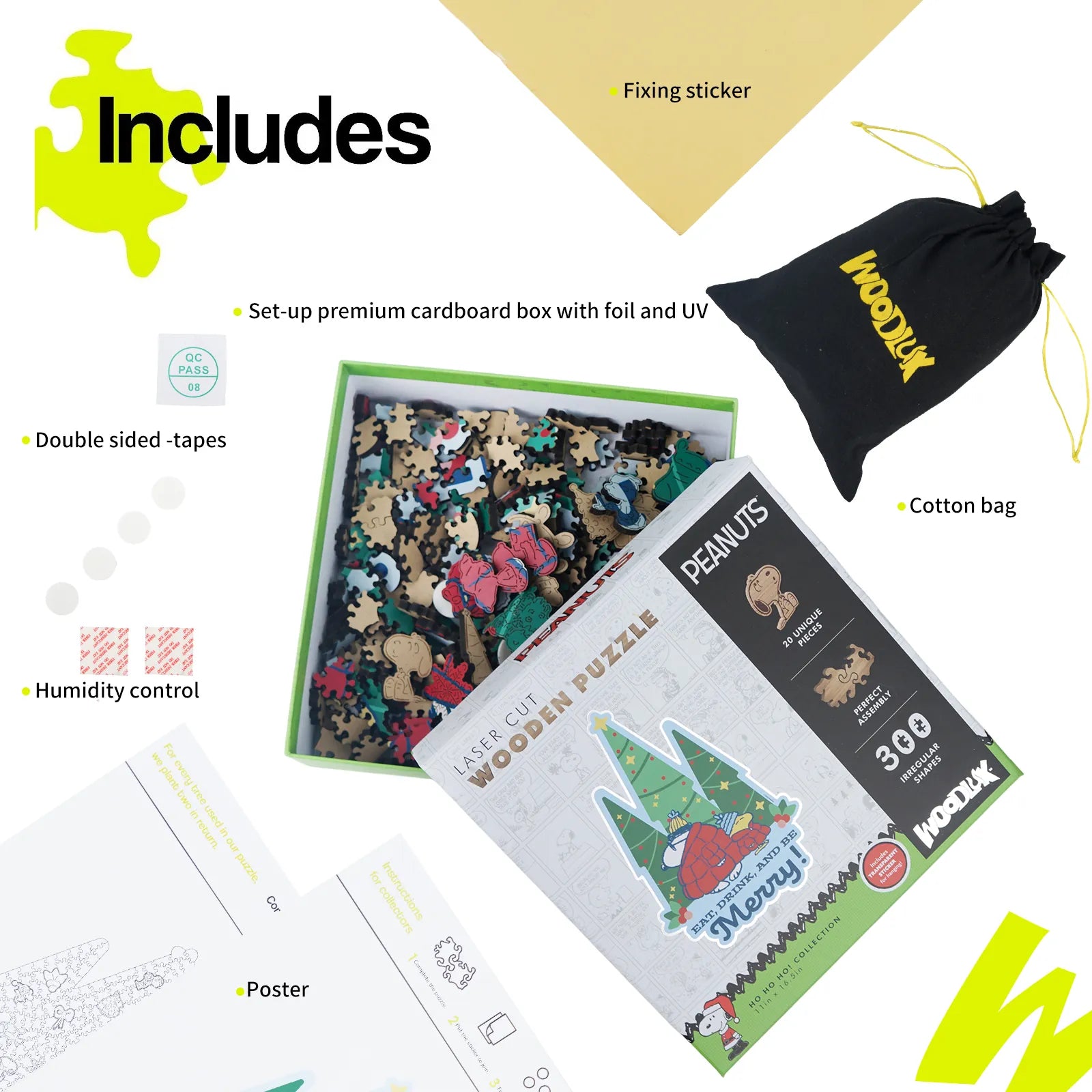 A wooden puzzle licensed from Peanuts. It features 300 irregular-shaped pieces cut with precision using laser, with a thickness of 5 mm for durability and a premium feel. The puzzle showcases a Snoopy special scene and includes 20 unique surprise shapes that add discovery and challenge. Sold as a gift suitable for families, Snoopy fans, or puzzle enthusiasts during holidays or birthdays, it emphasizes eco-friendly packaging and an accompanying cloth bag for storage and display. Overall, it highlights quality materials, intricate piece design, and collectible value.