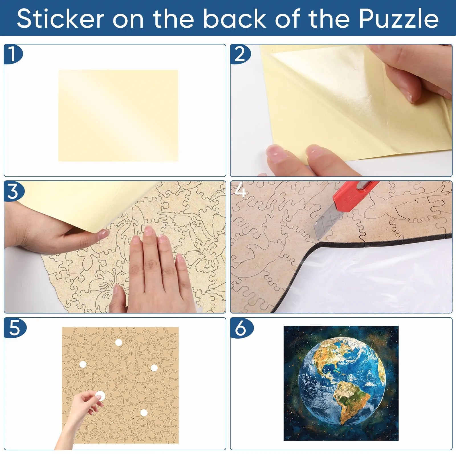 1 x unique shape wooden jigsaw puzzles, 1 x Reference picture, 1 x Puzzle Saver sticker, 4 x Double-sided Tapes, 1 x Storage bag & Wooden Box.