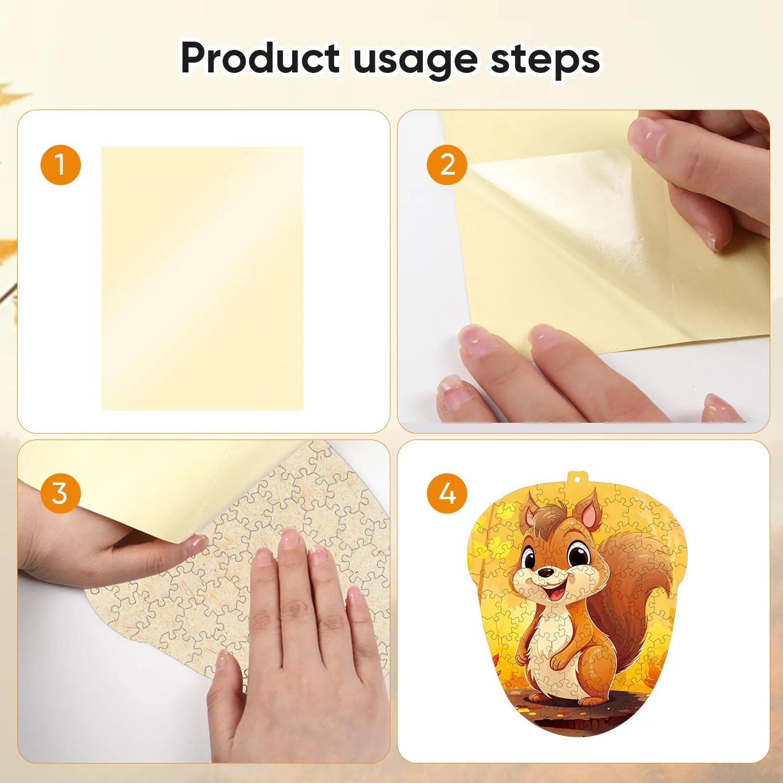 1 x unique shape wooden jigsaw puzzles, 1 x Reference picture, 1 x Puzzle Saver sticker, 4 x Double-sided Tapes, 1 x Storage bag & Wooden Box.