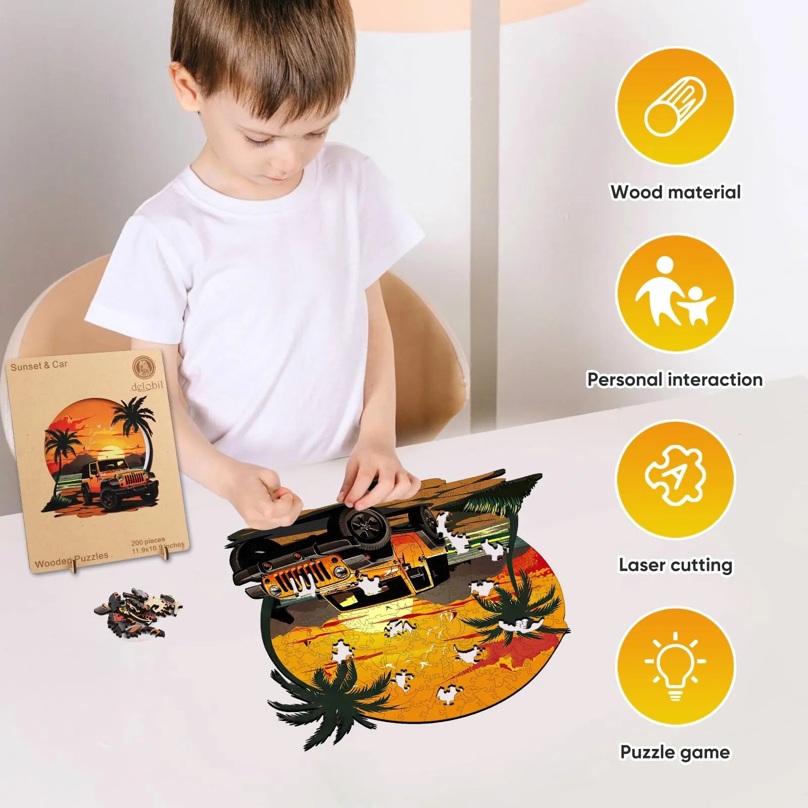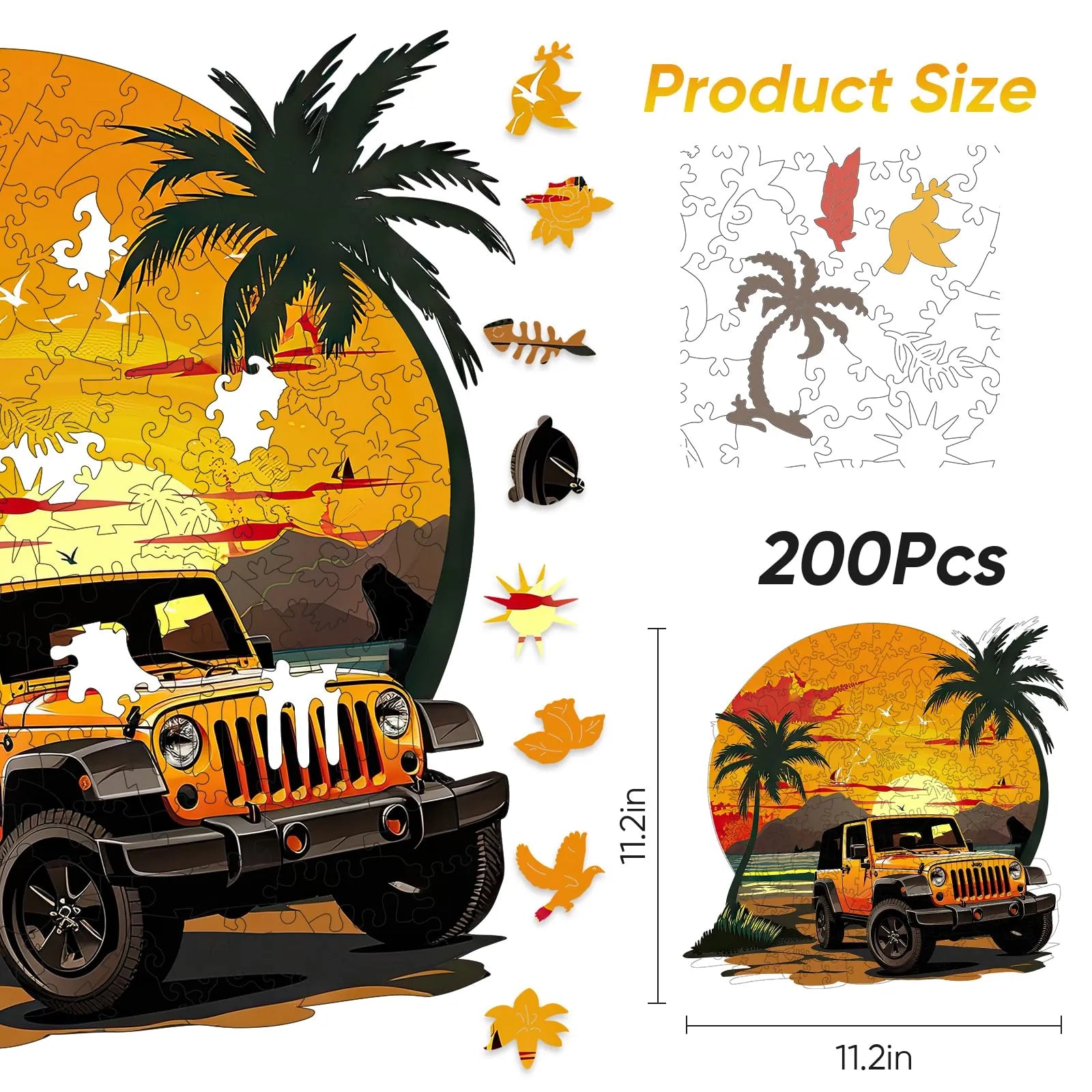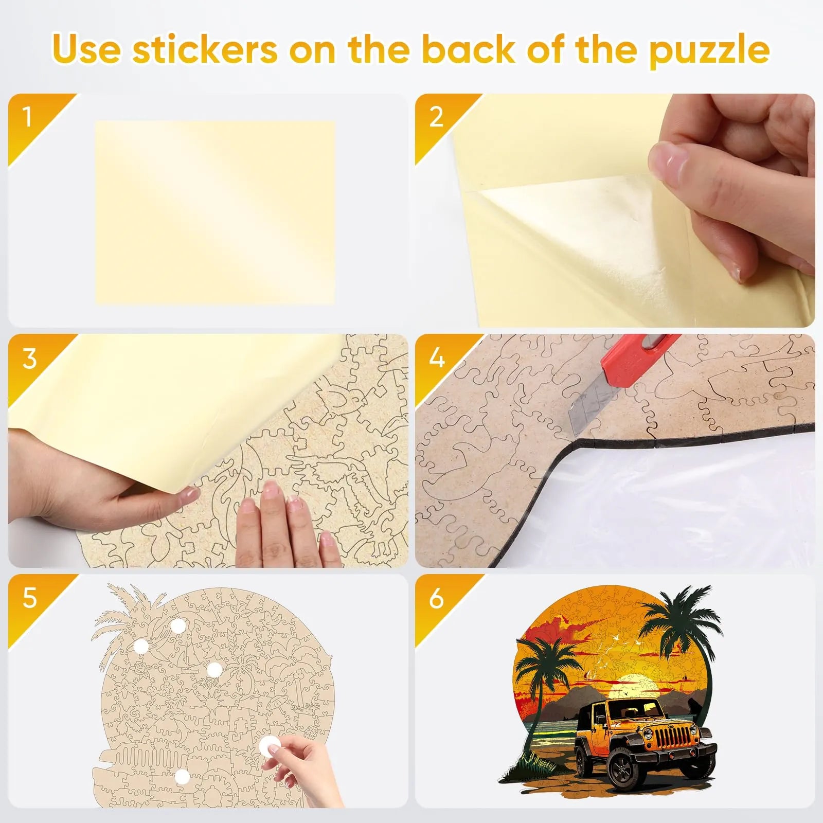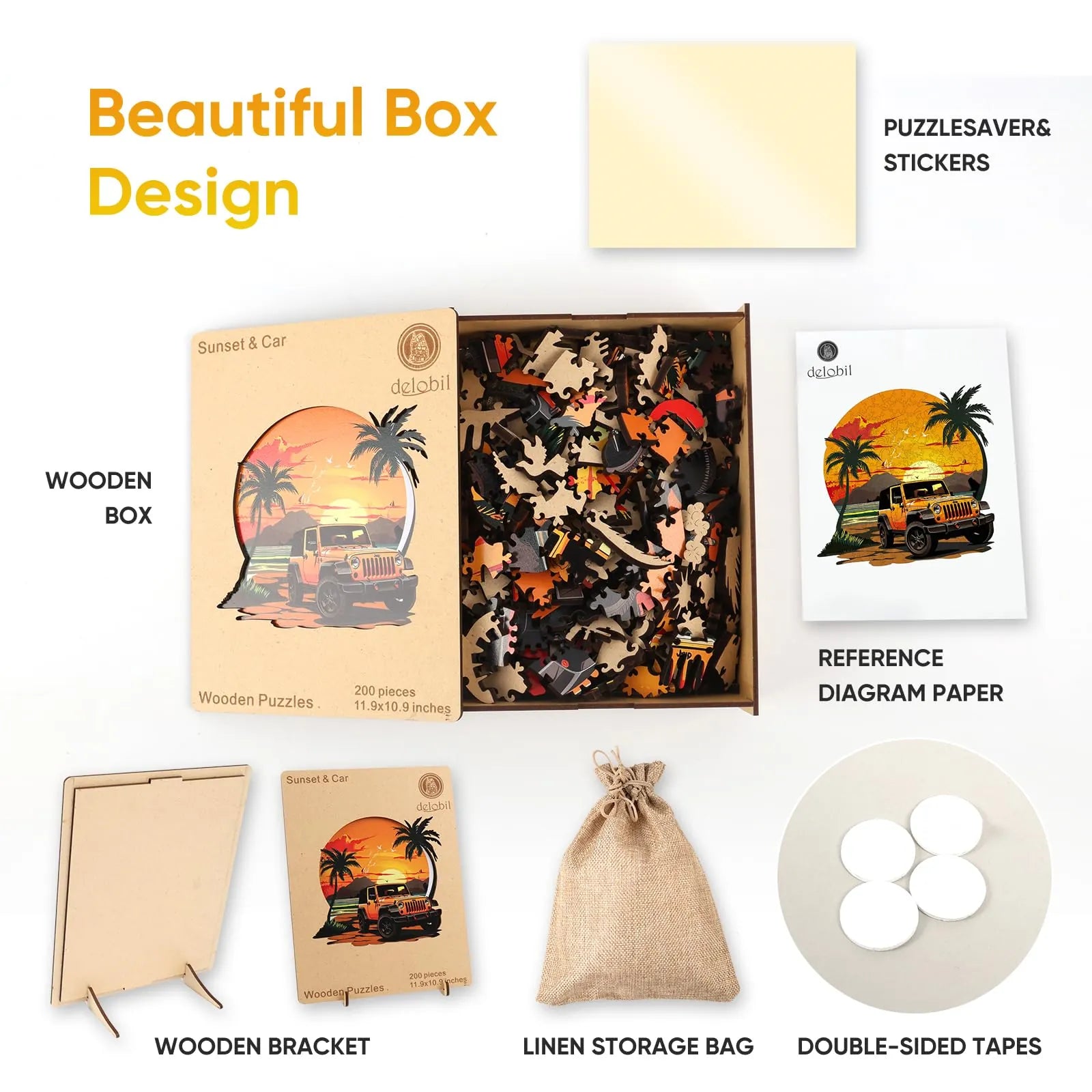 1 x unique shape wooden jigsaw puzzles, 1 x Reference picture, 1 x Puzzle Saver sticker, 4 x Double-sided Tapes, 1 x Storage bag & Wooden Box.