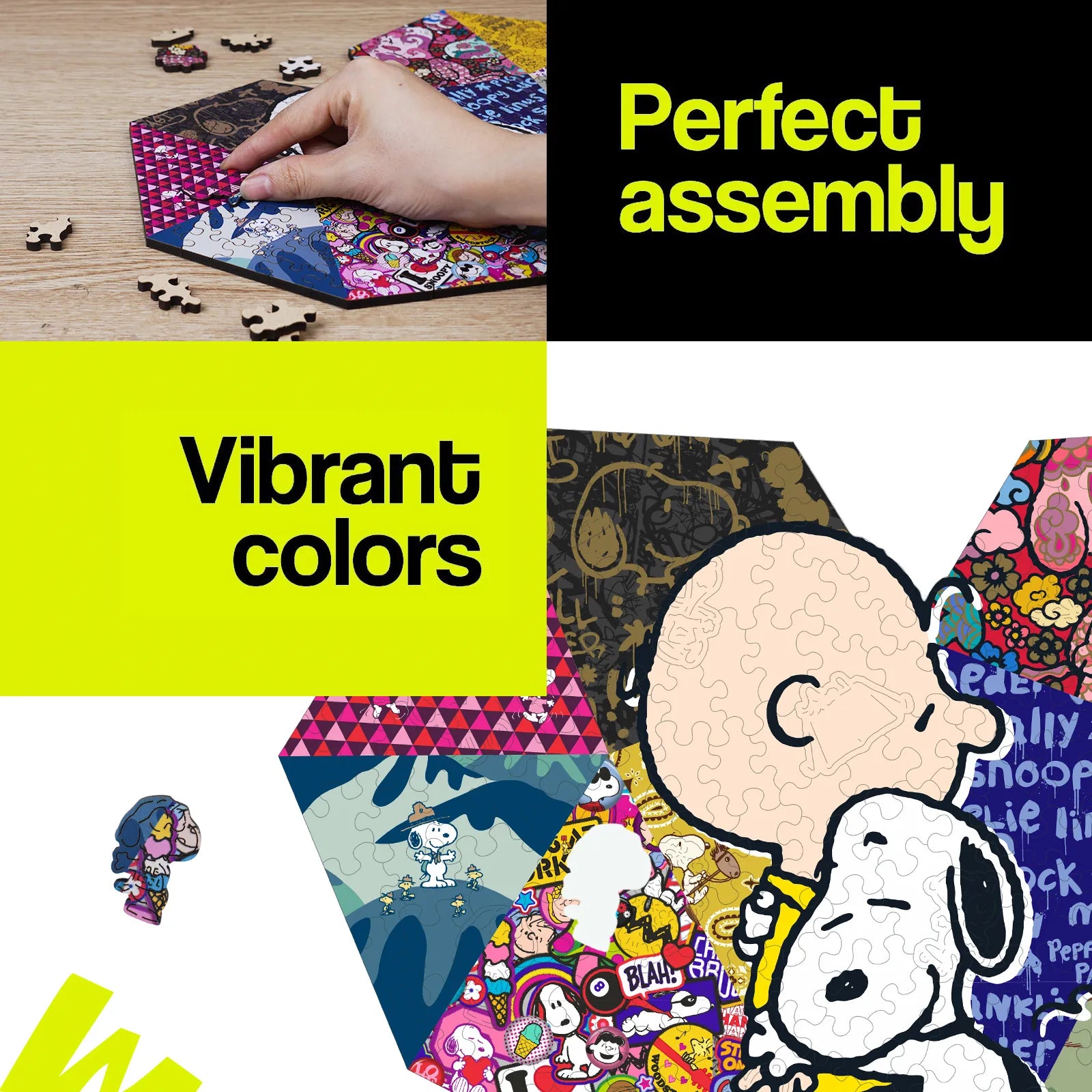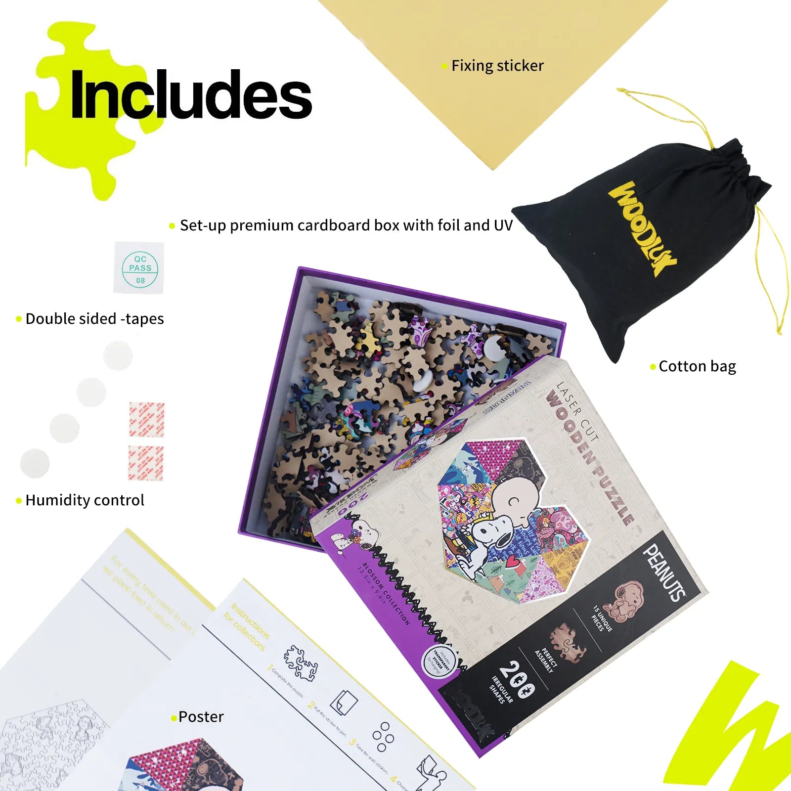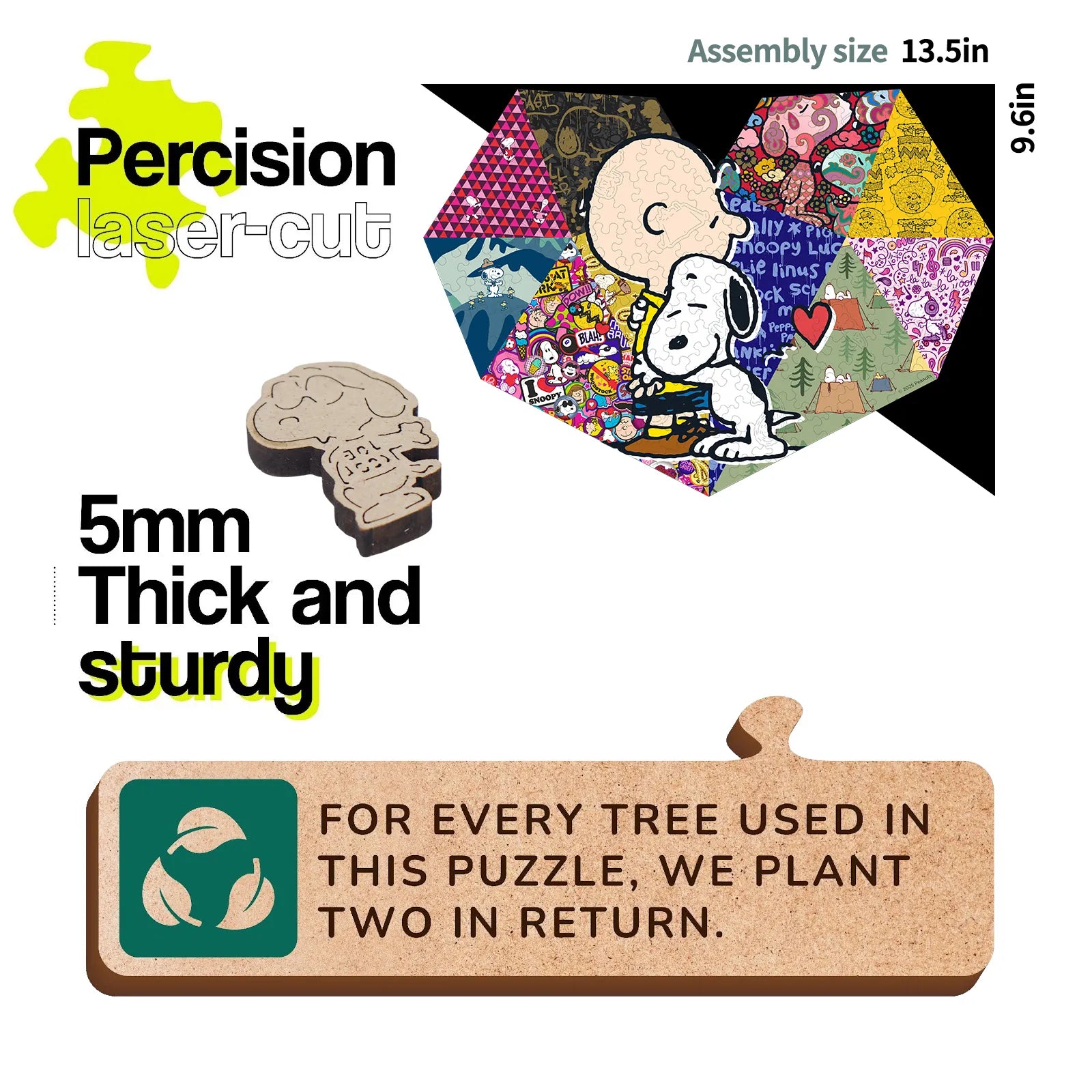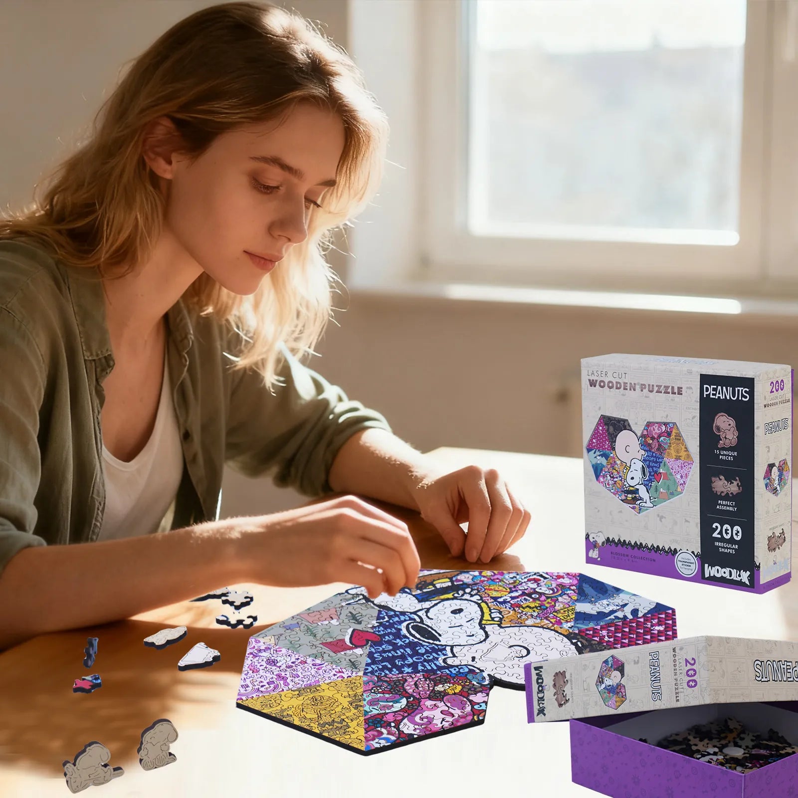 A wooden puzzle licensed from Peanuts. It features 200 irregular-shaped pieces cut with precision using laser, with a thickness of 5 mm for durability and a premium feel. The puzzle showcases a Snoopy special scene and includes 15 unique surprise shapes that add discovery and challenge. Sold as a gift suitable for families, Snoopy fans, or puzzle enthusiasts during holidays or birthdays, it emphasizes eco-friendly packaging and an accompanying cloth bag for storage and display. Overall, it highlights quality materials, intricate piece design, and collectible value.