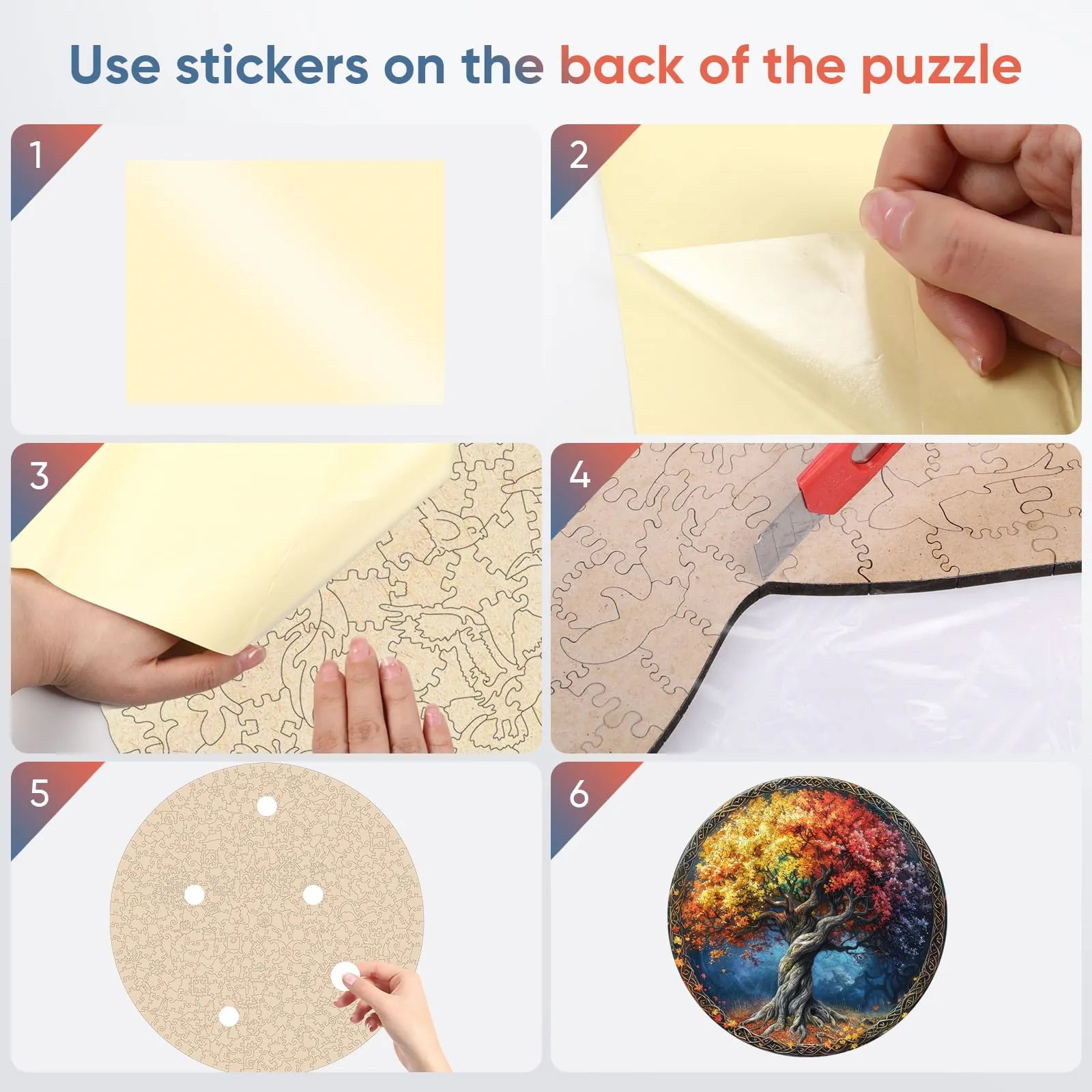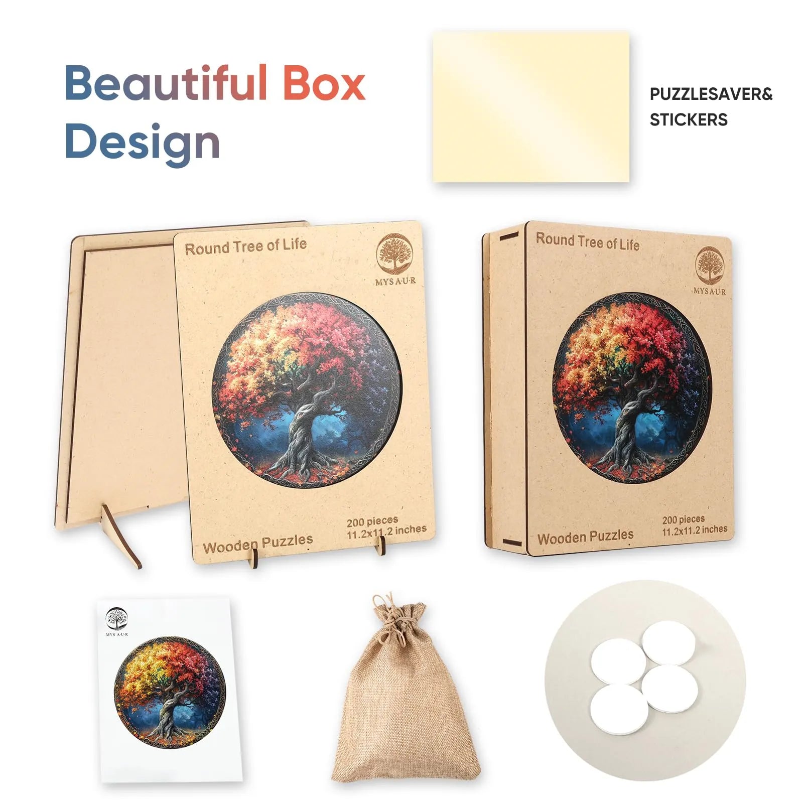 1 x unique shape wooden jigsaw puzzles, 1 x Reference picture, 1 x Puzzle Saver sticker, 4 x Double-sided Tapes, 1 x Storage bag & Wooden Box.