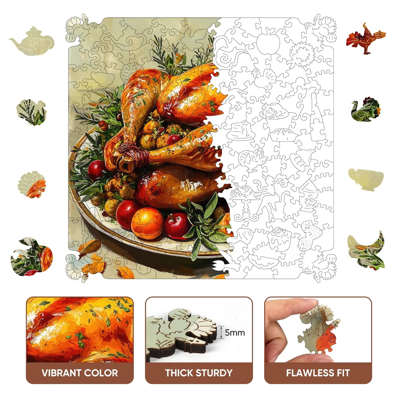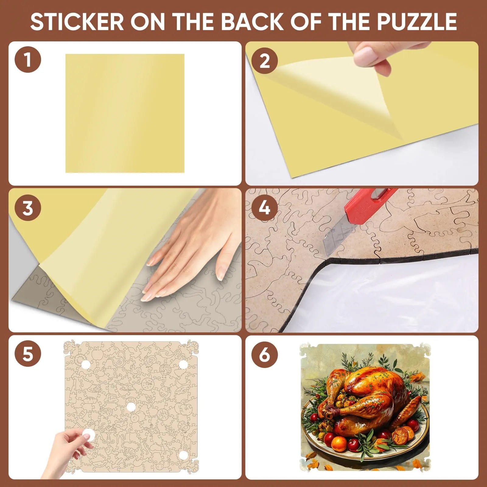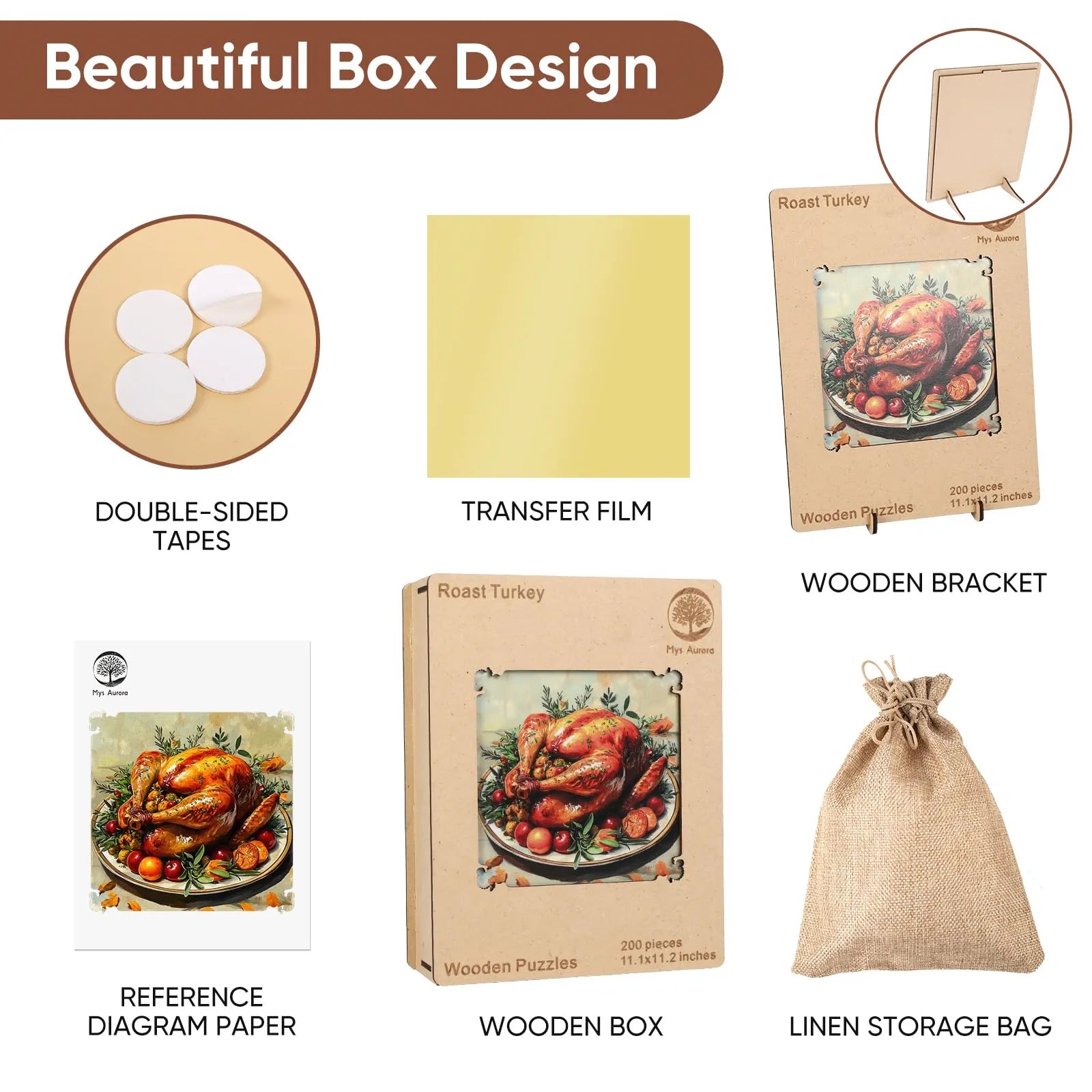1 x unique shape wooden jigsaw puzzles, 1 x Reference picture, 1 x Puzzle Saver sticker, 4 x Double-sided Tapes, 1 x Storage bag & Wooden Box.