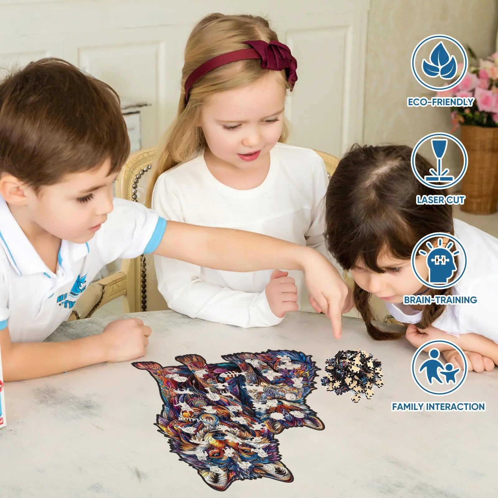 1 x unique shape wooden jigsaw puzzles, 1 x Reference picture, 1 x Puzzle Saver sticker, 4 x Double-sided Tapes, 1 x Storage bag & Wooden Box.